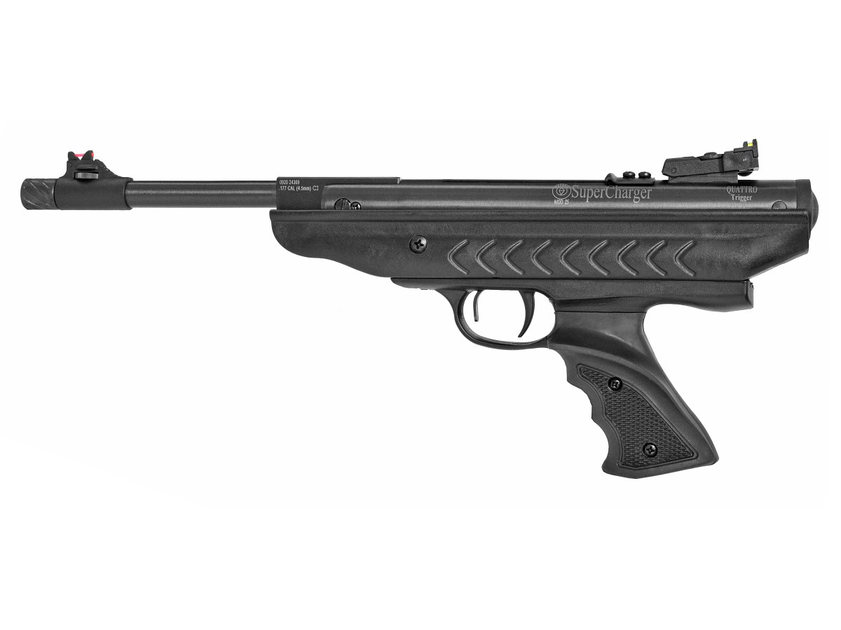 Hatsan 25 SuperCharger - zalamovacia vzduchová pištoľ s dvojstupňovou nastaviteľnou spúšťou Quattro, plne nastaviteľným cieľnikom a výškovo nastaviteľnou muškou so svetlovodnými vláknami Truglo. Systém na redukciu otrasov pri výstrele „XRS-Recoil Reduction System“ pre zreteľne hladký výstrel. Spätný ráz je počas výstrelu absorbovaný, vďaka čomu je streľba presnejšia a pohodlnejšia. Drážky 11 mm umožňujú inštaláciu kolimátoru alebu pouškohľadu. Balenie obsahuje hliníkový nástavec pre ľahšie zalamovanie hlavne.