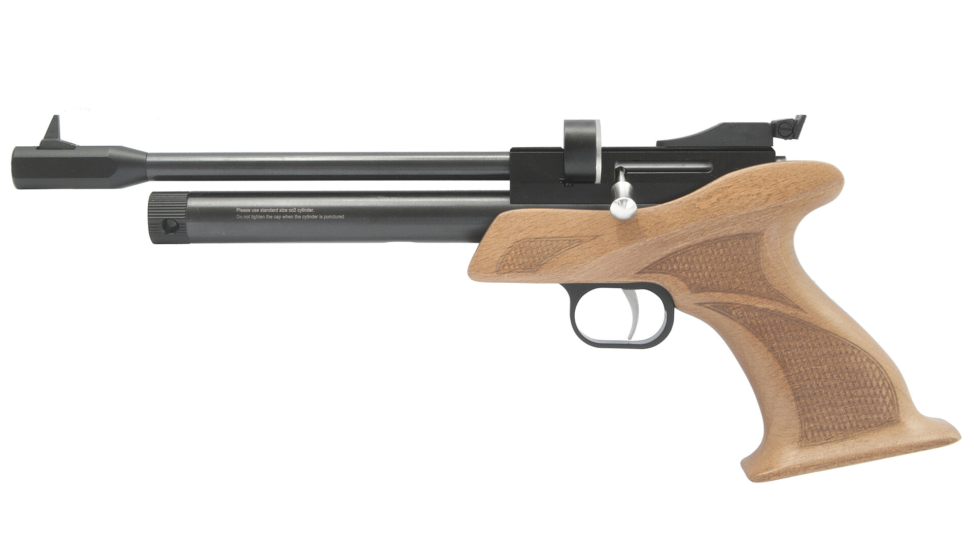 Vzduchová pištoľ pre športovú streľbu na terč poháňaná plynom CO2 dodávaným z 12g bombičky CO2. Presná streľba bez spätného rázu.